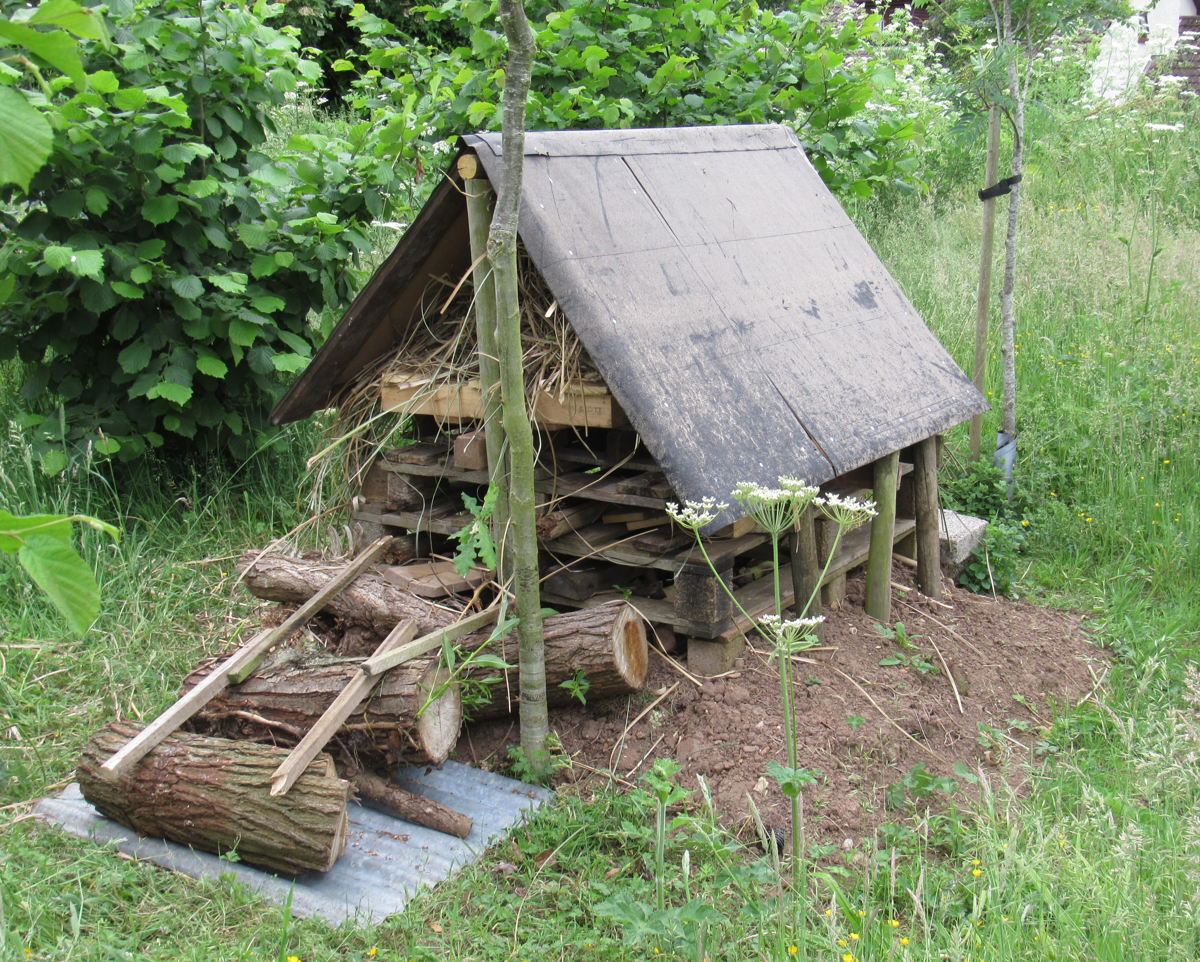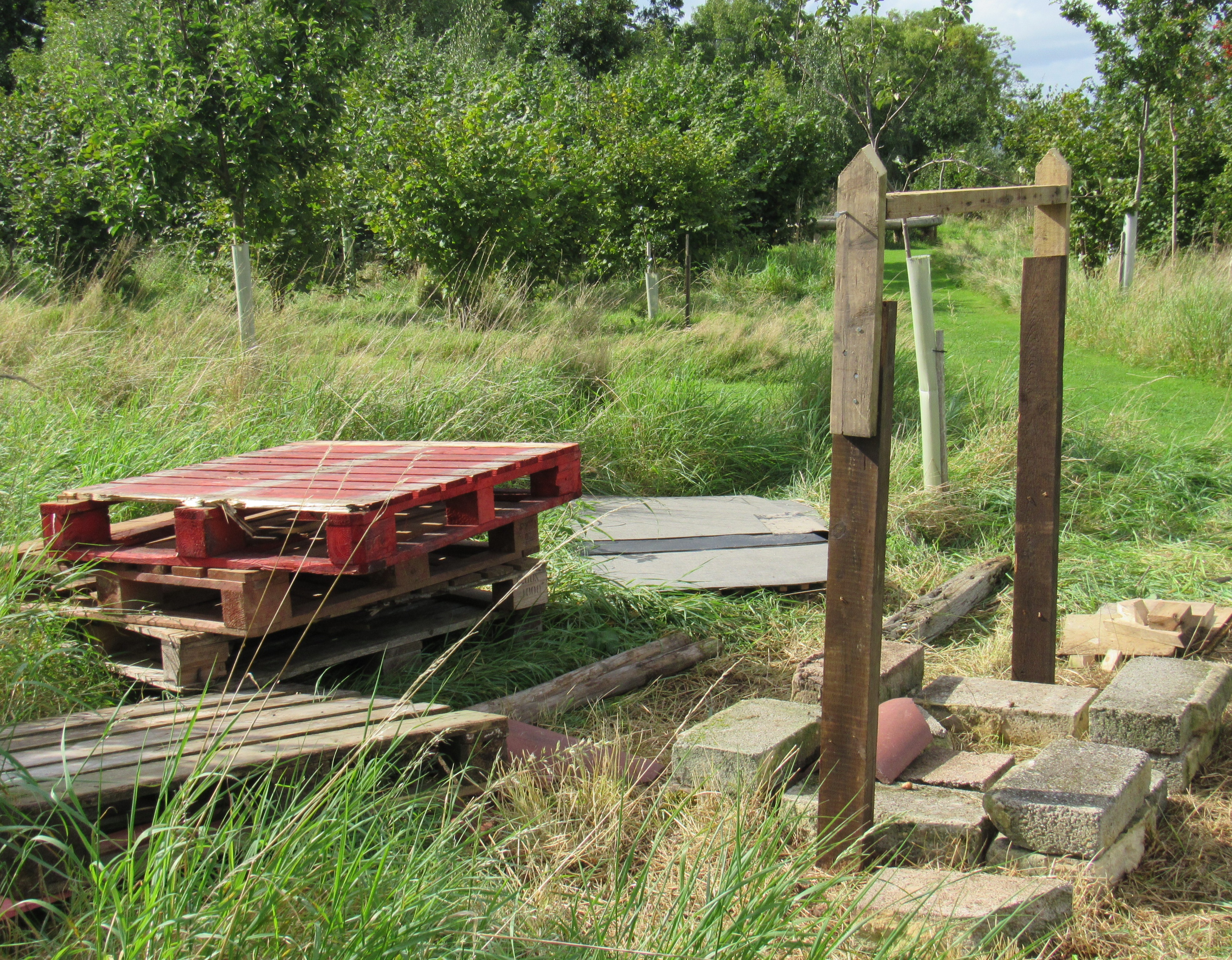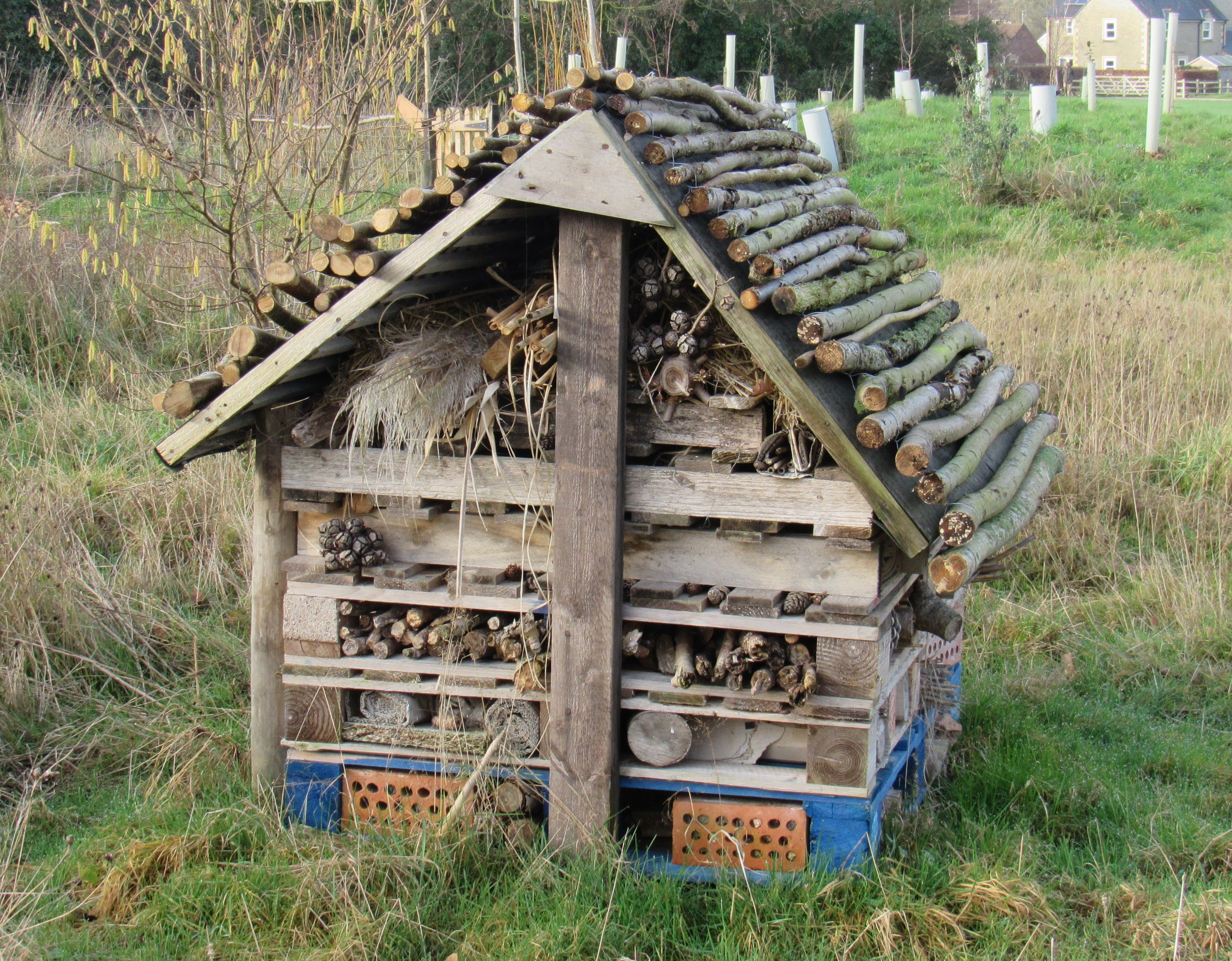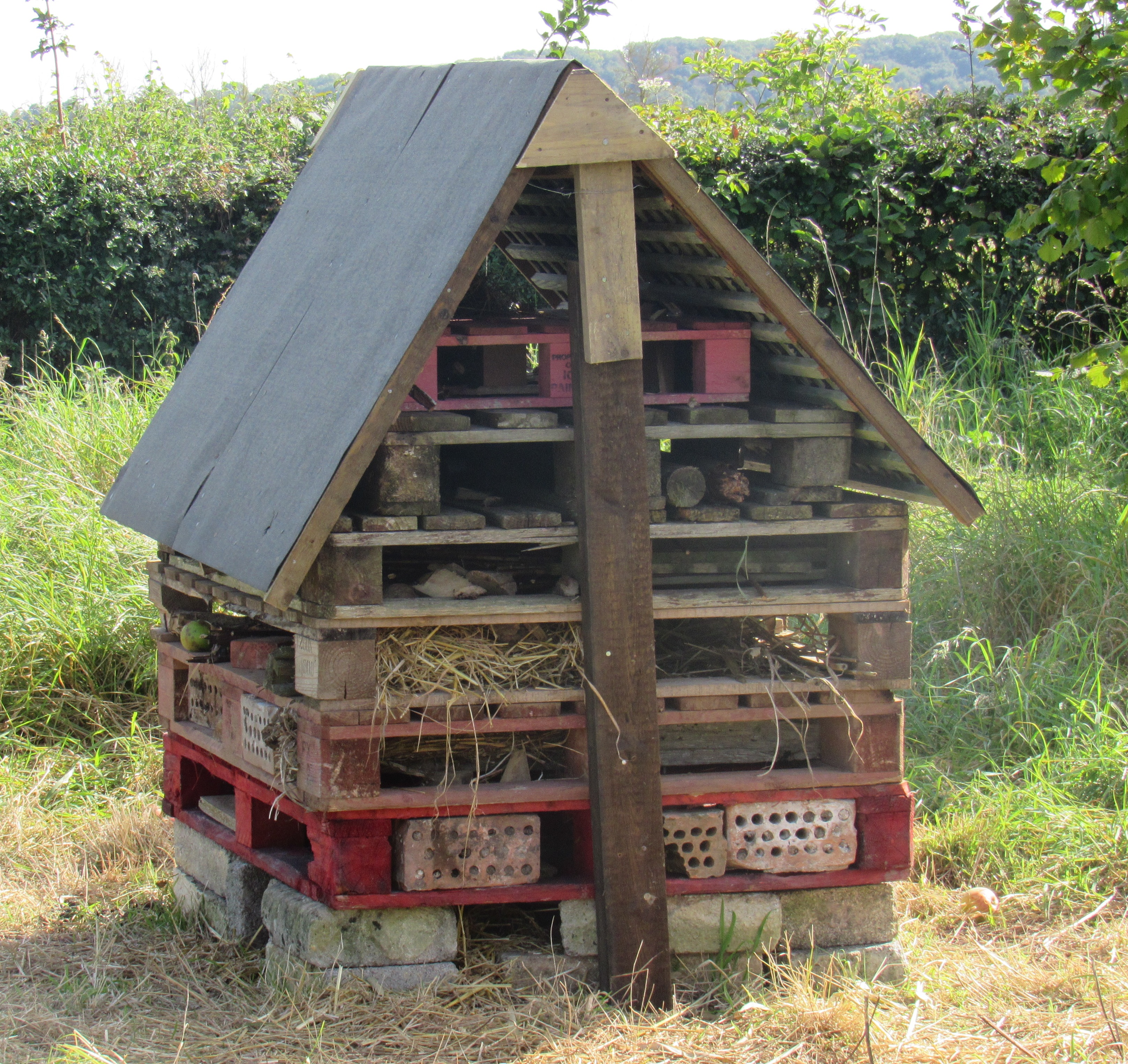 We have built three ‘insect hotels’ or shelters at the Community Woodland, using pallets donated by various people from building sites around the village, and roofed them with old wooden garden screens covered with left-over roofing felt. We left a gap to allow a small amount of rain in as we wanted them to be sheltered, but not too dry. This is based on guesswork rather than research, but we will be monitoring how they fare.