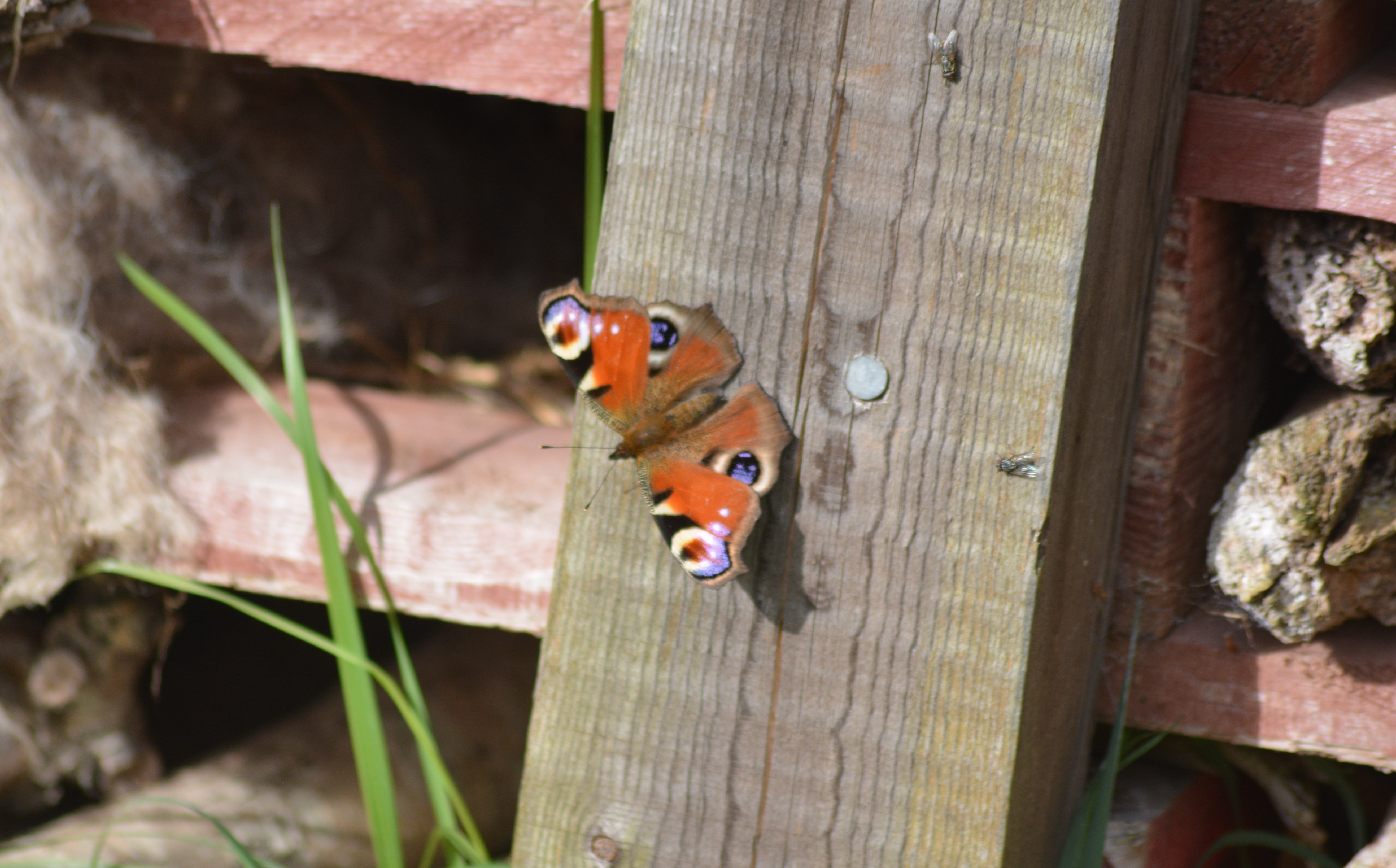 A Peacock butterfly was observed flying in and out of the red insect hotel at the top of the woodland in October 2019. We think it may have been inspecting it as a possible overwintering site and hope it found a warm, dry shelter there for the winter.