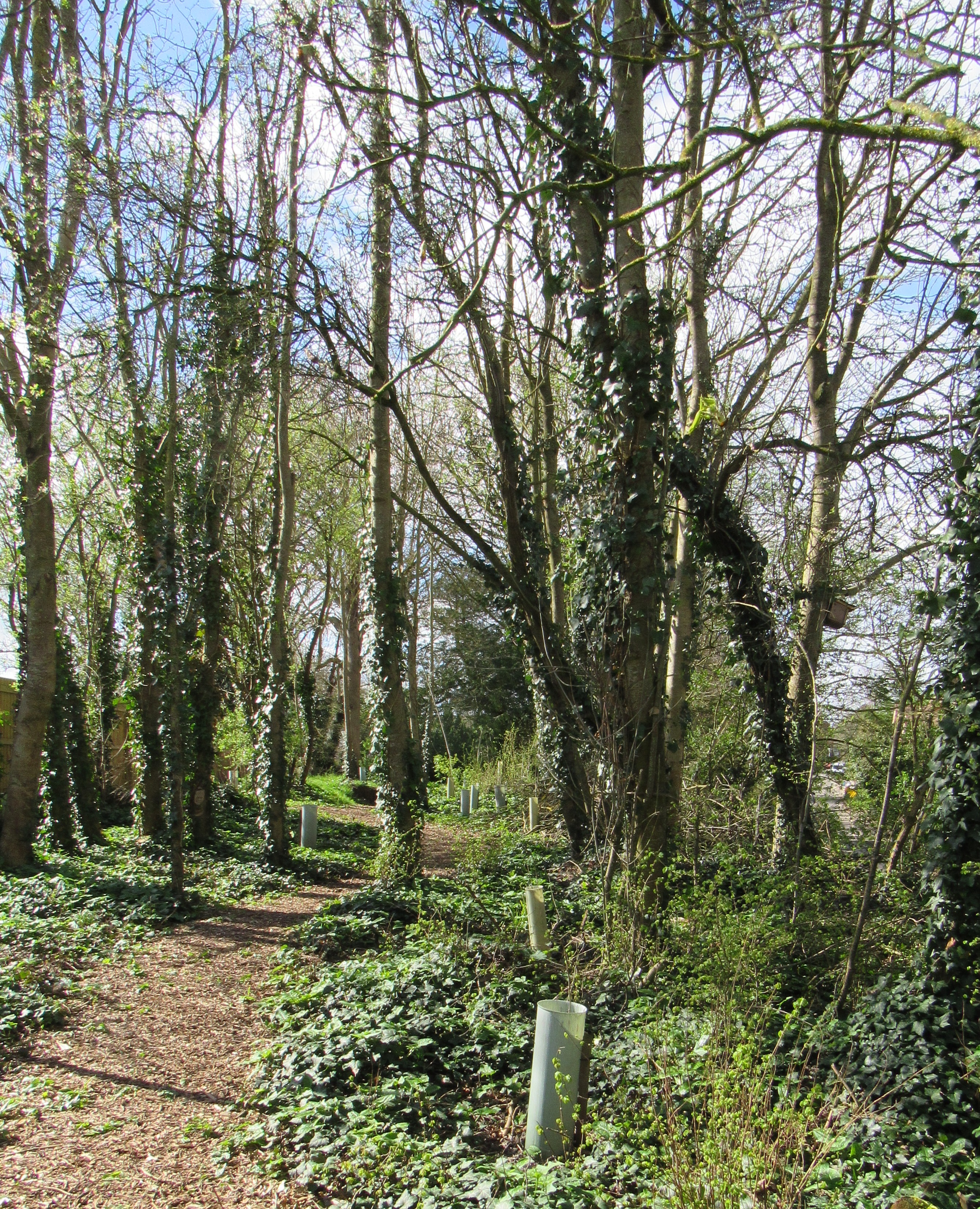 Here, there are many mature trees, some with bird boxes, as well as new planting.