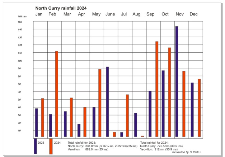 Dave Patten has sent us the rainfall statistics he recorded for 2024. His graph below compares the figures with 2023 and show some interesting variations.