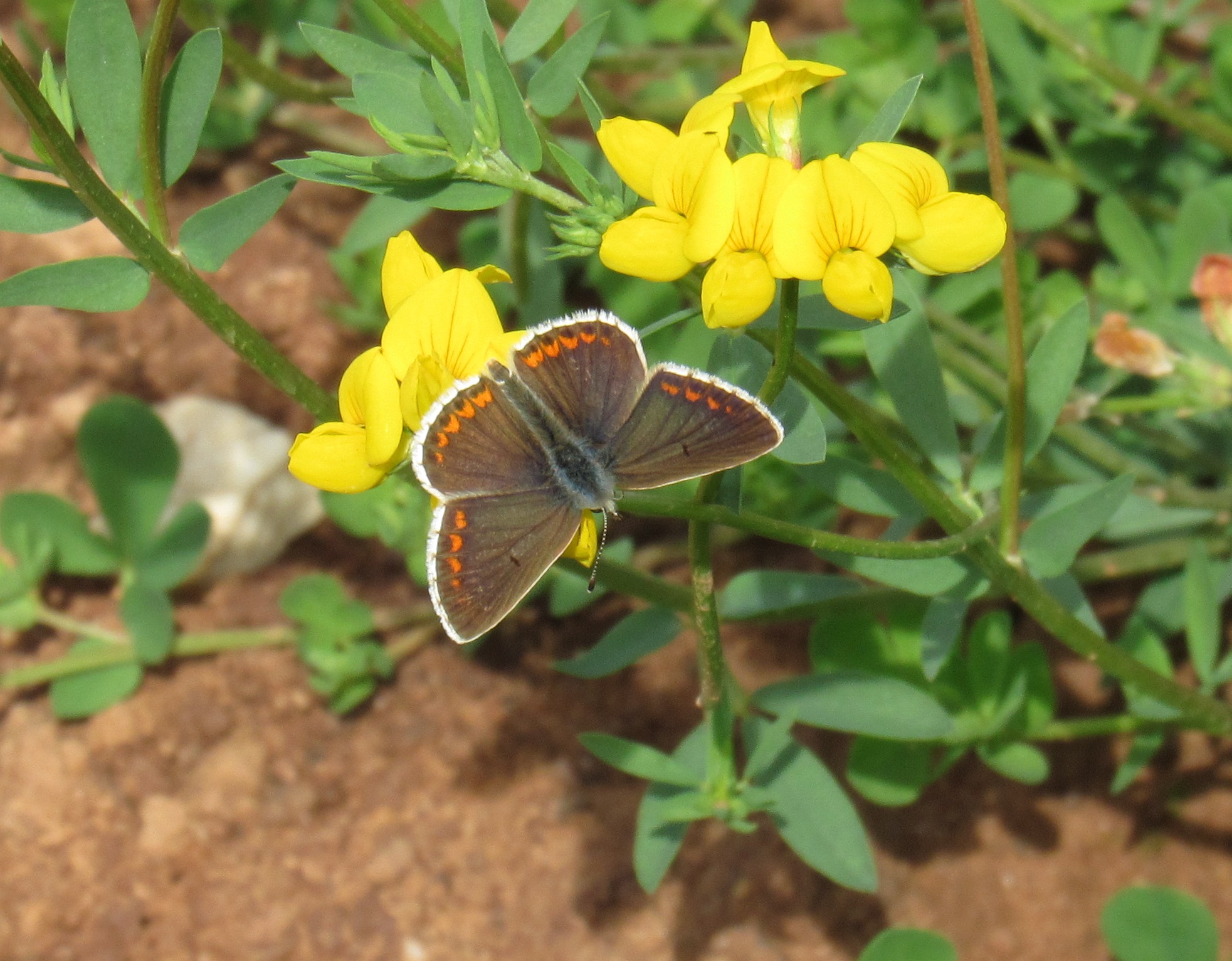 Brown Argus male (left) and Common Blue male (right) on the bee bank