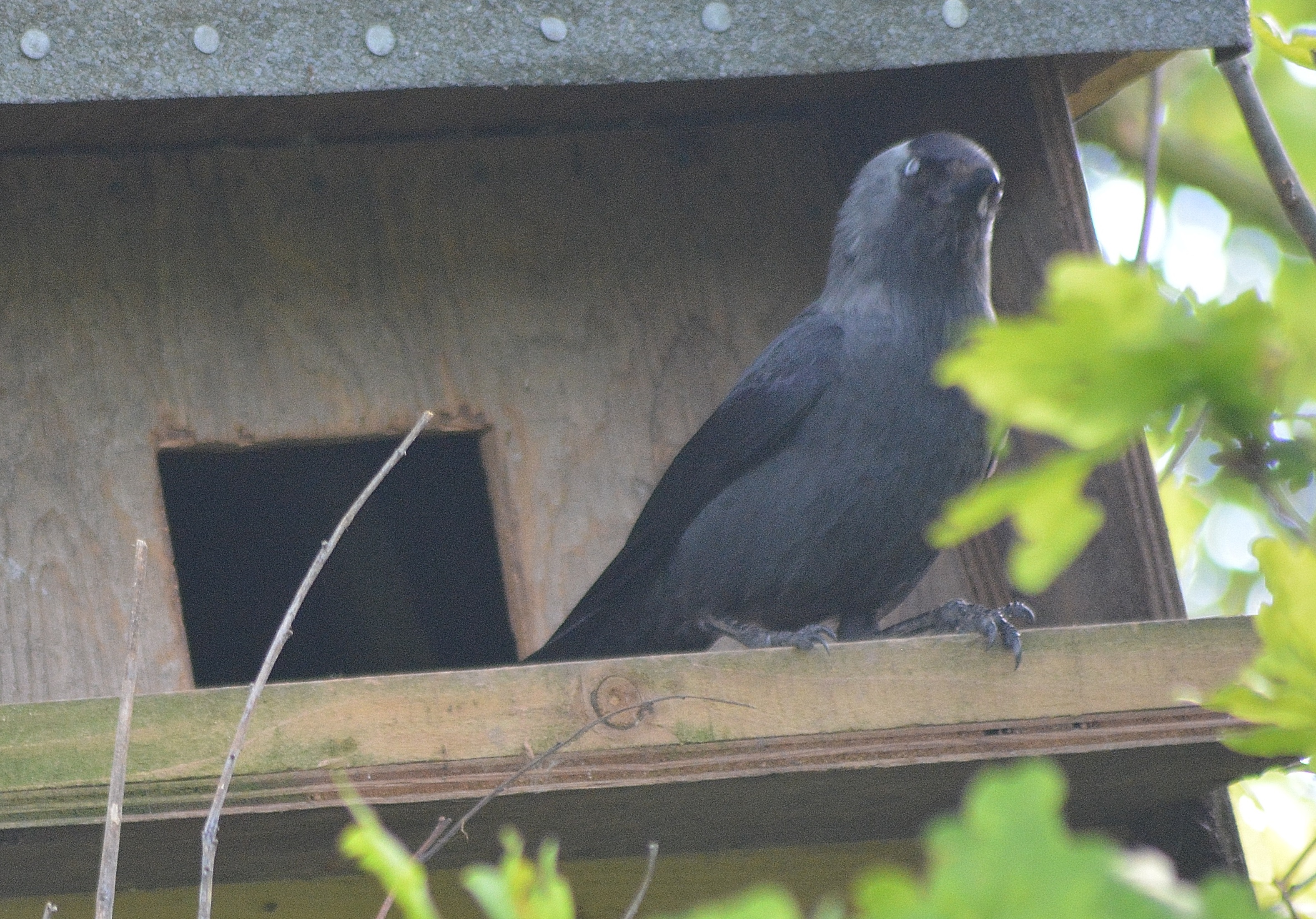 Jackdaw using the owl box in the oak tree, spring 2019 (photo Tony Hoskin)