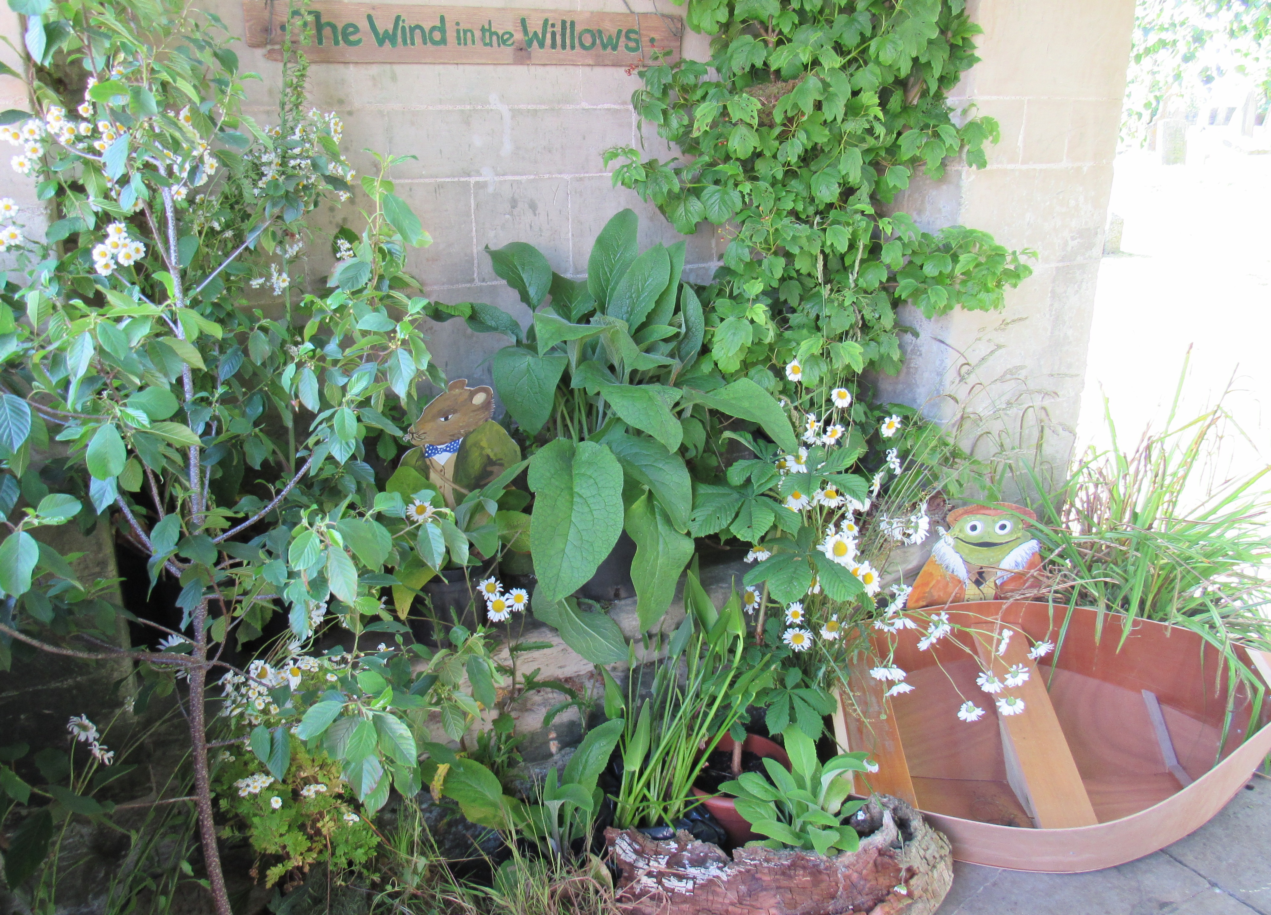 The Wildlife Group joined in this lovely celebration of plants and flowers with an arrangement of native trees, shrubs and plants in the lych gate based on The Wind in the Willows by Kenneth Grahame. Liz Gibbs painted the characters of Toad, Ratty, Mole and Badger, and we were very grateful to David Birch for making a magnificent boat for Ratty.
