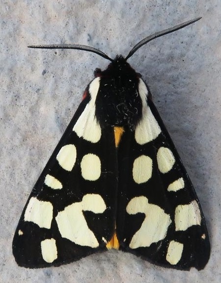 The Cream-spot Tiger is a moth which will rest quite visibly during the day, relying on its warning colouration to deter predators, so it worth keeping an eye open at the base of hedgerows.