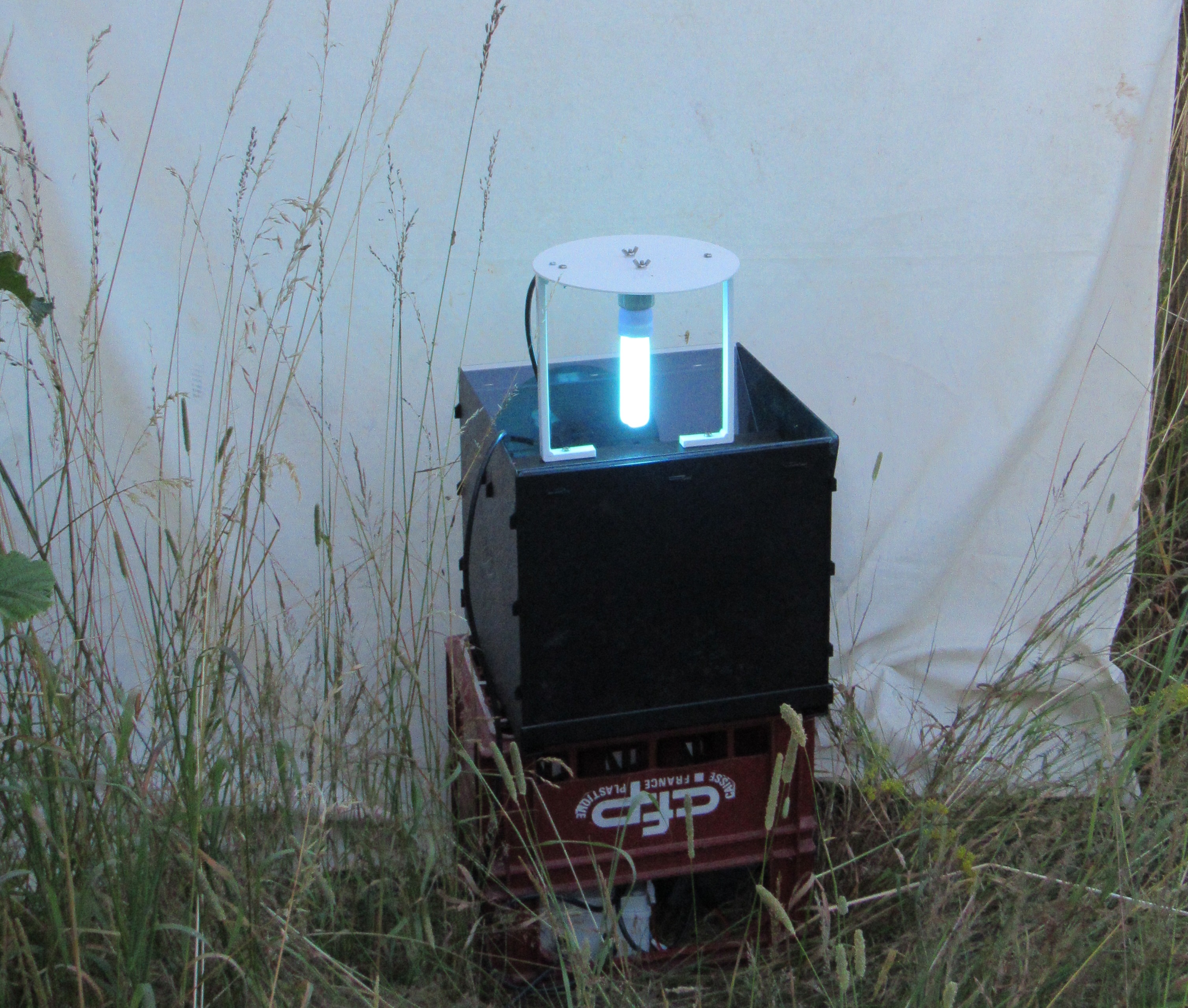 Skinner moth trap in situ with battery beneath it and backing sheet behind