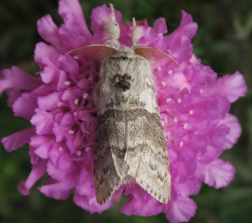 The female Muslin Moth has the same markings, but a totally different, white, ground colour. The Pale Tussock is showing his characteristic resting posture with furry forefeet pushed forward. Both species are often very placid moths which, if attracted to light and not disturbed, will rest like that for long periods.