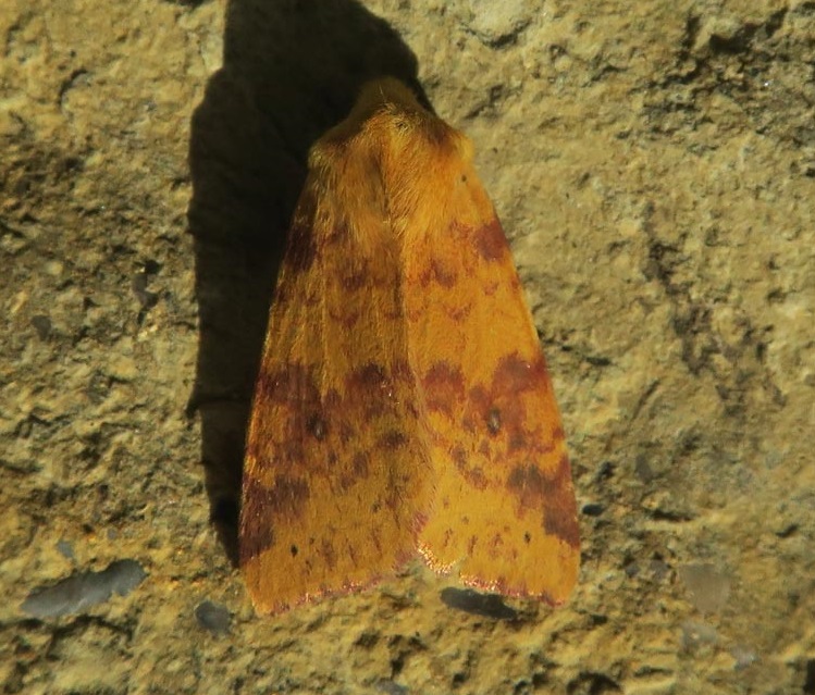 Orange Moth (so named for obvious reasons), again not rare, but local and another first for me. With two in one night, there must be a breeding population nearby. In contrast to the Poplar Hawkmoth, this is an extremely flighty moth, and the photo is of the slightly less tatty of the two.