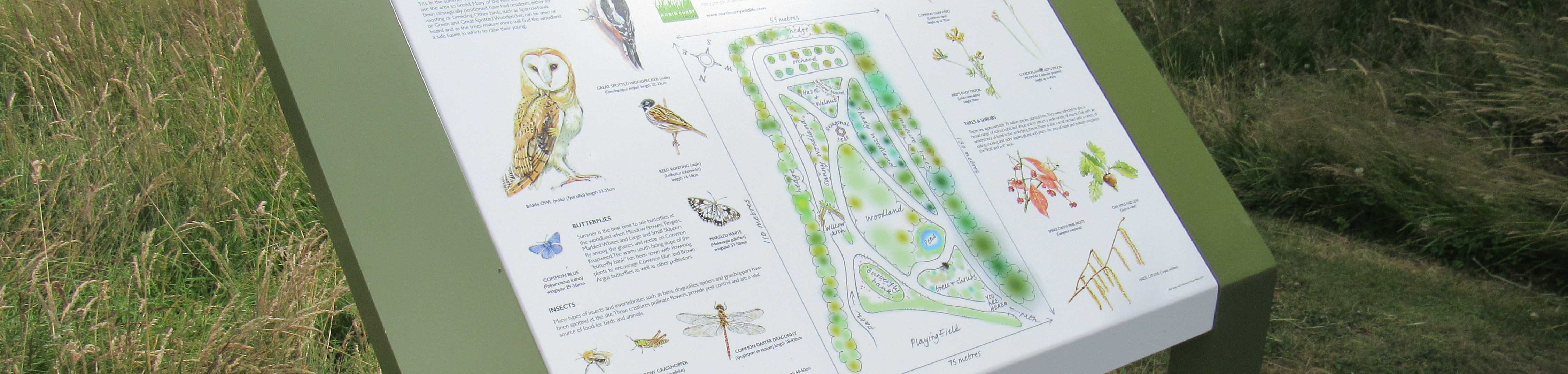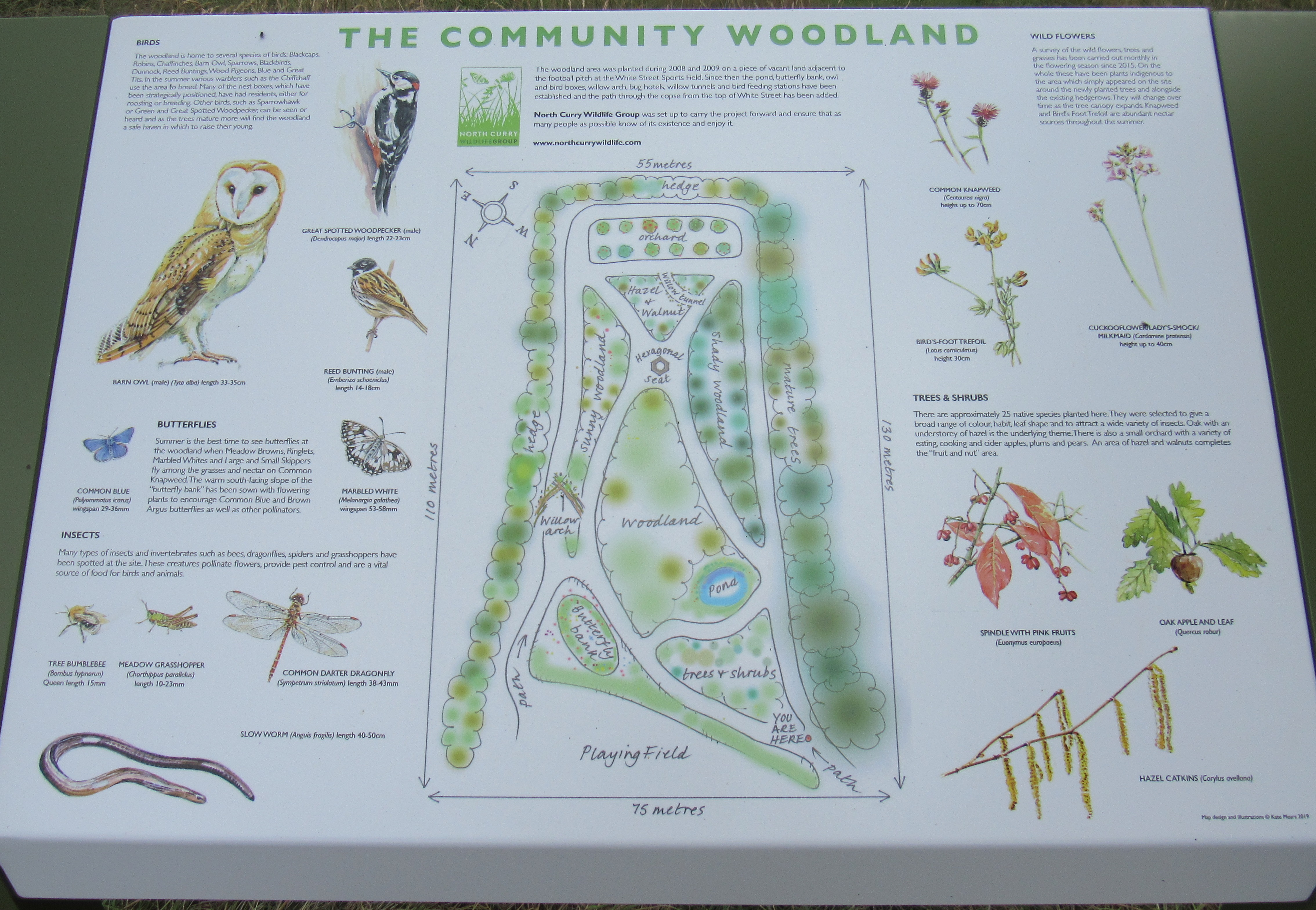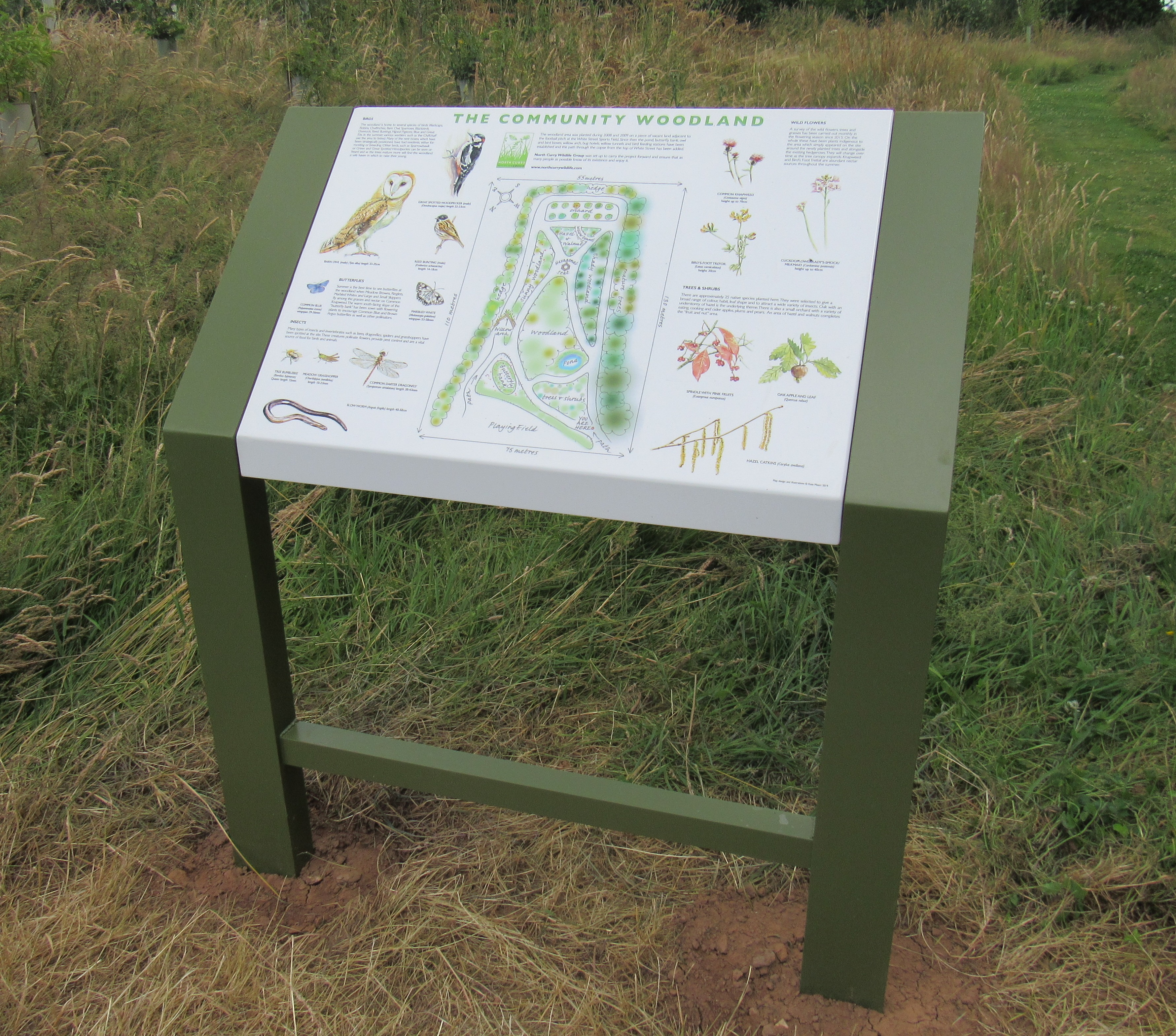 We were absolutely delighted when Kate and Simon Mears offered to design a board for us to be situated at the Community Woodland to give information to visitors about the plants and wildlife to be found there, and we are thrilled to announce that this is now on site.