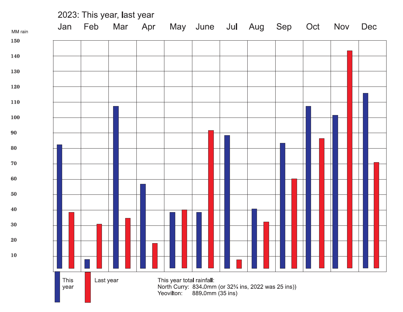 Rainfall data for North Curry for 2023 collected by Dave Patten and compared with last year's records: